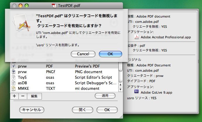 そして、「すべてを変更...」をしたときは、クリエータコードを無視するオプションを設定するのはやめてもらいたい。だって、後戻りできないんだもん。UTI のデフォルトアプリケーションを変更するだけでいいじゃないか。