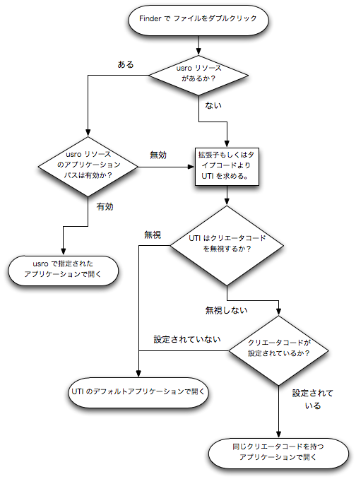 Mac OS X でファイルを開くアプリケーションが決定される仕組みを長々と説明してきたけど、それをフローチャートにまとめてみた。