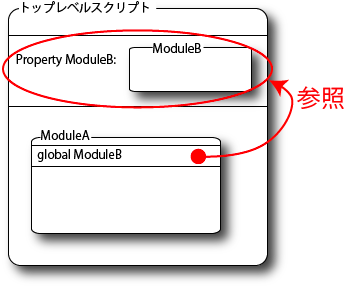 あるスクリプトを load script コマンドによってトップレベルのスクリプトにロードすることを考える。ロードされるスクリプト(Module Script と呼ぶことにする)の中で、トップレベルの property と同名の global 変数を宣言しておくと、トップレベルのプロパティにアクセスできるようになる。