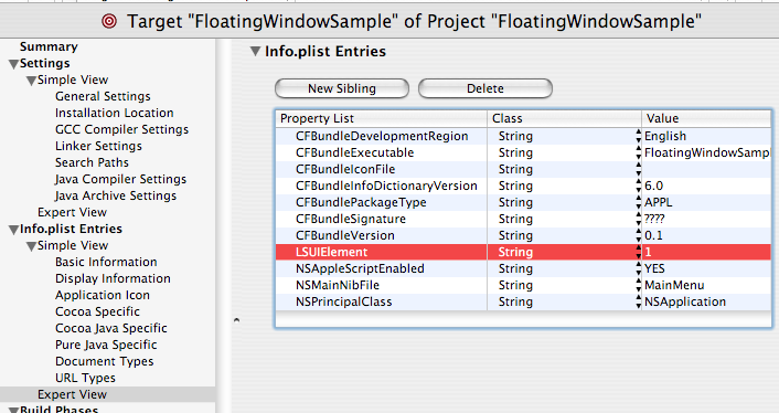 このように、Info.plist に LSUIElement という Entry を新たにつくり、その値を1に設定します。このようにすると、メニューバーを持たないアプリケーションになります。また、Dock にも表示されなくなります。しかし、Floating Window をクリックすると Floating Window を所有するアプリケーションが前面に出てくるのは変わらないようです。メニューバーは変わらないのですが、もともと前面にあったアプリケーションの Floating Window は消えてしまいますし、選択されていた window が active でなくなってしまいます。