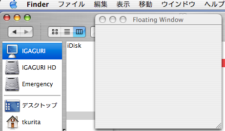 普通の window の level は 0です。window の level を 0 以上にしてやれば、すべてのアプリケーションの window の上に表示される window を作る事ができます。window がどの level に属すべきかは決まっているようで、Floating Window の場合は「3」のようです。AppleScript Studio の Reference の Window Class の解説部分に記述があります。