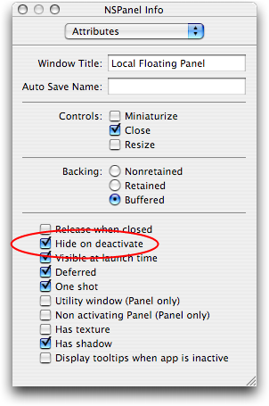 「Utility Window」を On にすると、自動的に property「floating」と「hides when deactivated」が true に設定されます。またどういうわけか、Interface Builder で「Hide on deactivate」を Off にできなくなってしまいます。
